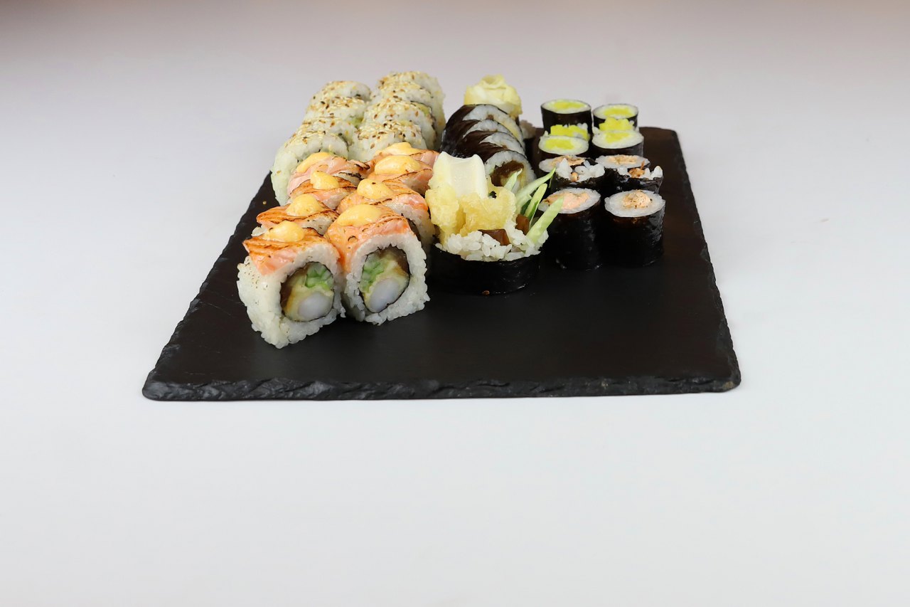8x California z łososiem obłożona awokado 8x California z pastą 6x Futomak z łososiem 6x Hosomak z surimi 6x Hosomak z oshinko