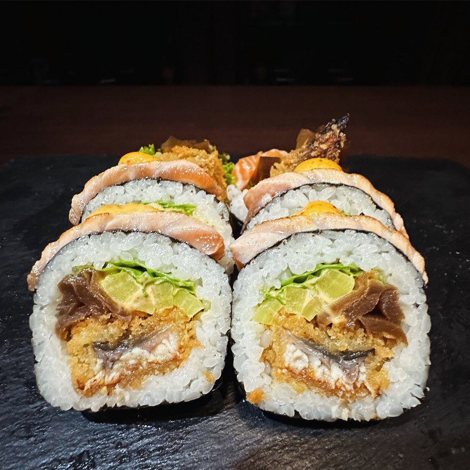 6x Futomak z węgorzem w panko obłożony opalanym łososiem, tykwa, kizami, oshinko, majonez truflowy, oliwa truflowa