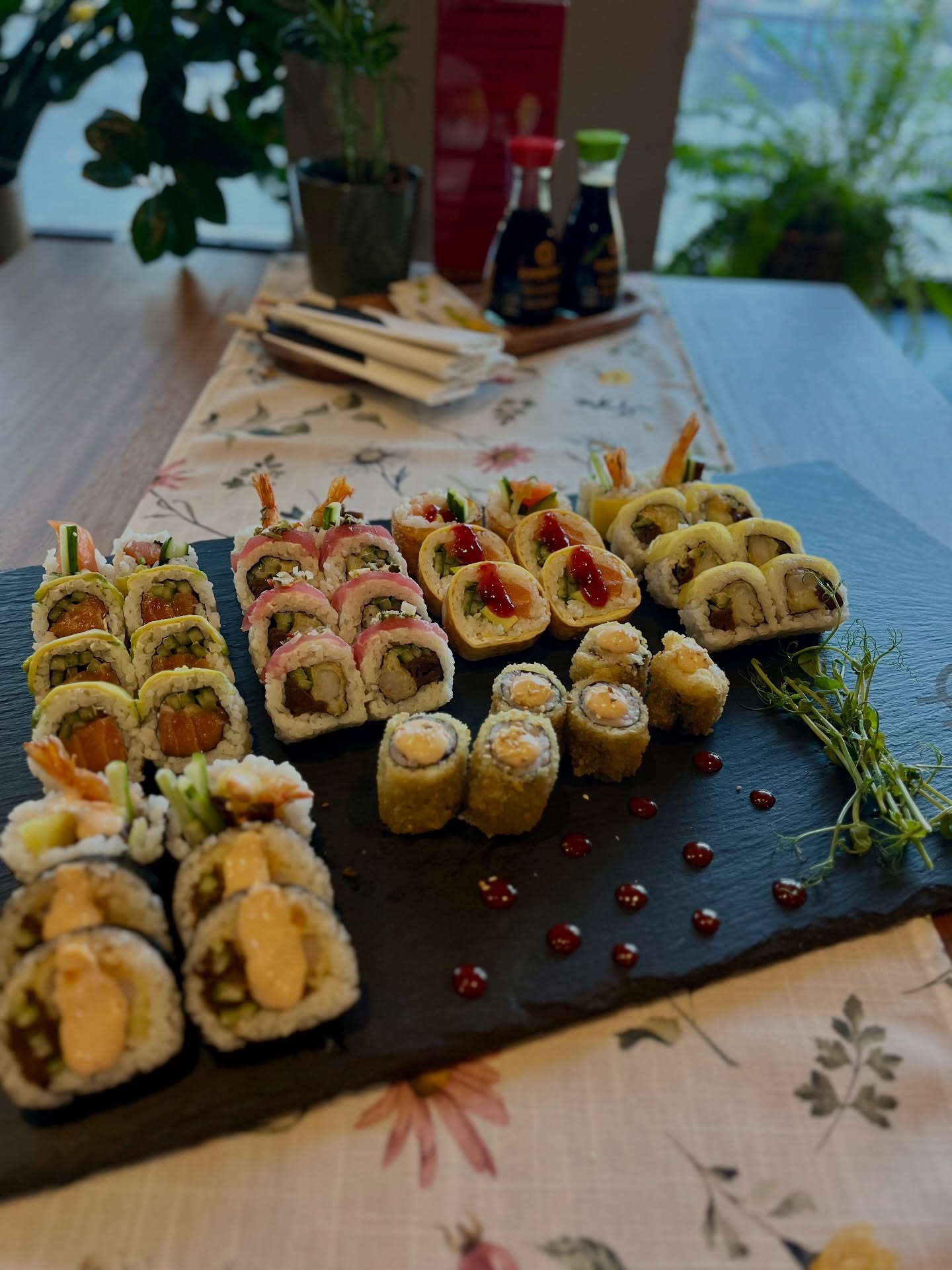 8x California z krewetką w tempurze, obłożona tuńczykiem z salsą kolrendrową 8x California z łososiem, obłożona awokado 6x Futomak z krewetką w tempurze i majonezem truflowym 6x Tamago z łososiem i żurawiną 6x Hosomak w tempurze z surimi